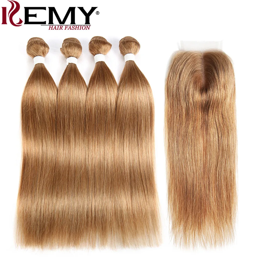 Light Brown 27# Brazilian Straight Human Hair Bundles With Closure 4x4 KEMY Pre-Colored 100% Human