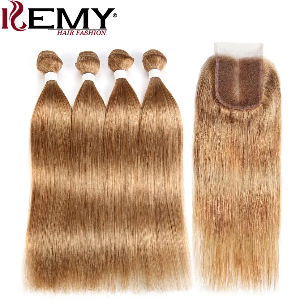 New arrival Light Brown 27# Brazilian Straight Human Hair Bundles With Closure 4x4 KEMY Pre-Colored 100% Human